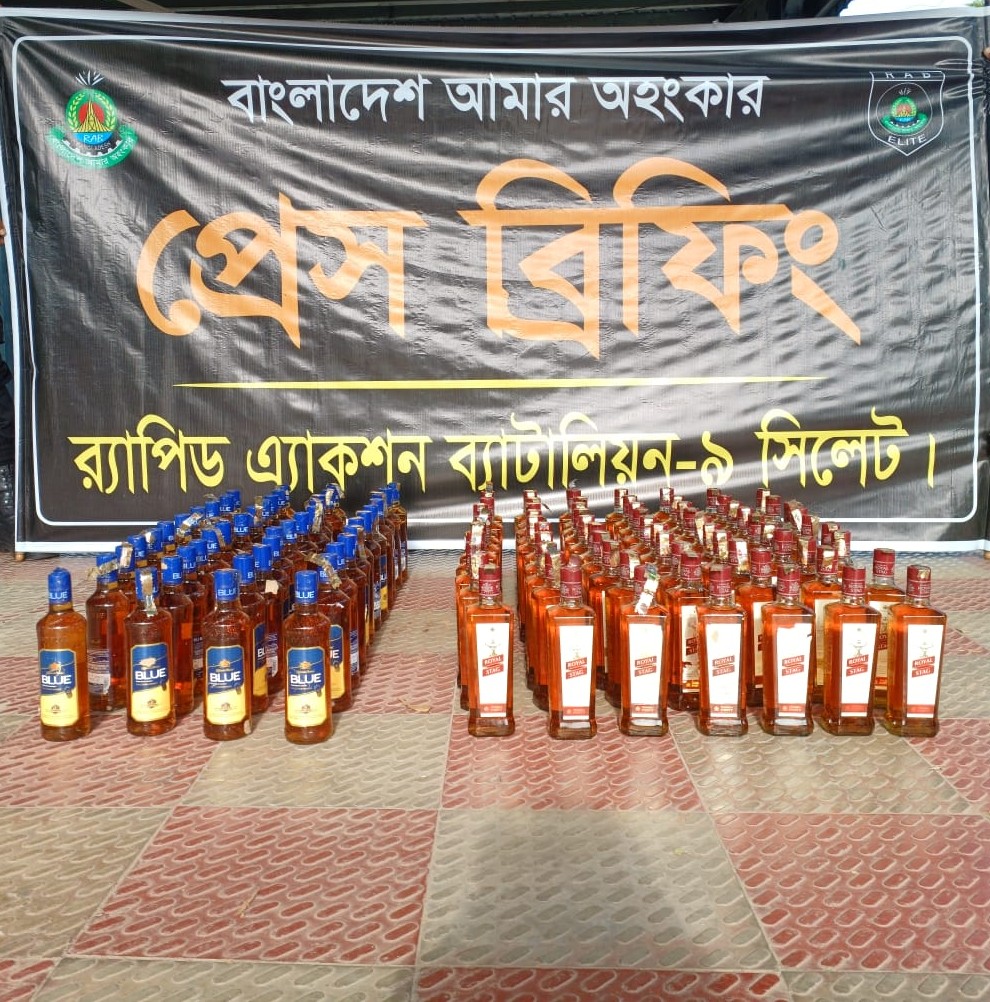 র্যাপিড অ্যাকশন ব্যাটালিয়ন (র্যাব)-৯ এর বিশেষ অভিযানে সিলেটের জৈন্তাপুর থেকে ১১৬ বোতল বিদেশী মদ এবং চোরাচালানকৃত ৩৫ হাজার ৮০০ রাউন্ড এয়ার গানের গুলি উদ্ধার করা হয়েছে। এ সময় তিন মাদক ব্যবসায়ীকে গ্রেফতার করা হয়।